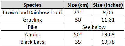 Fish of the species listed below may not be fished and must be immediately released if their length is less than :