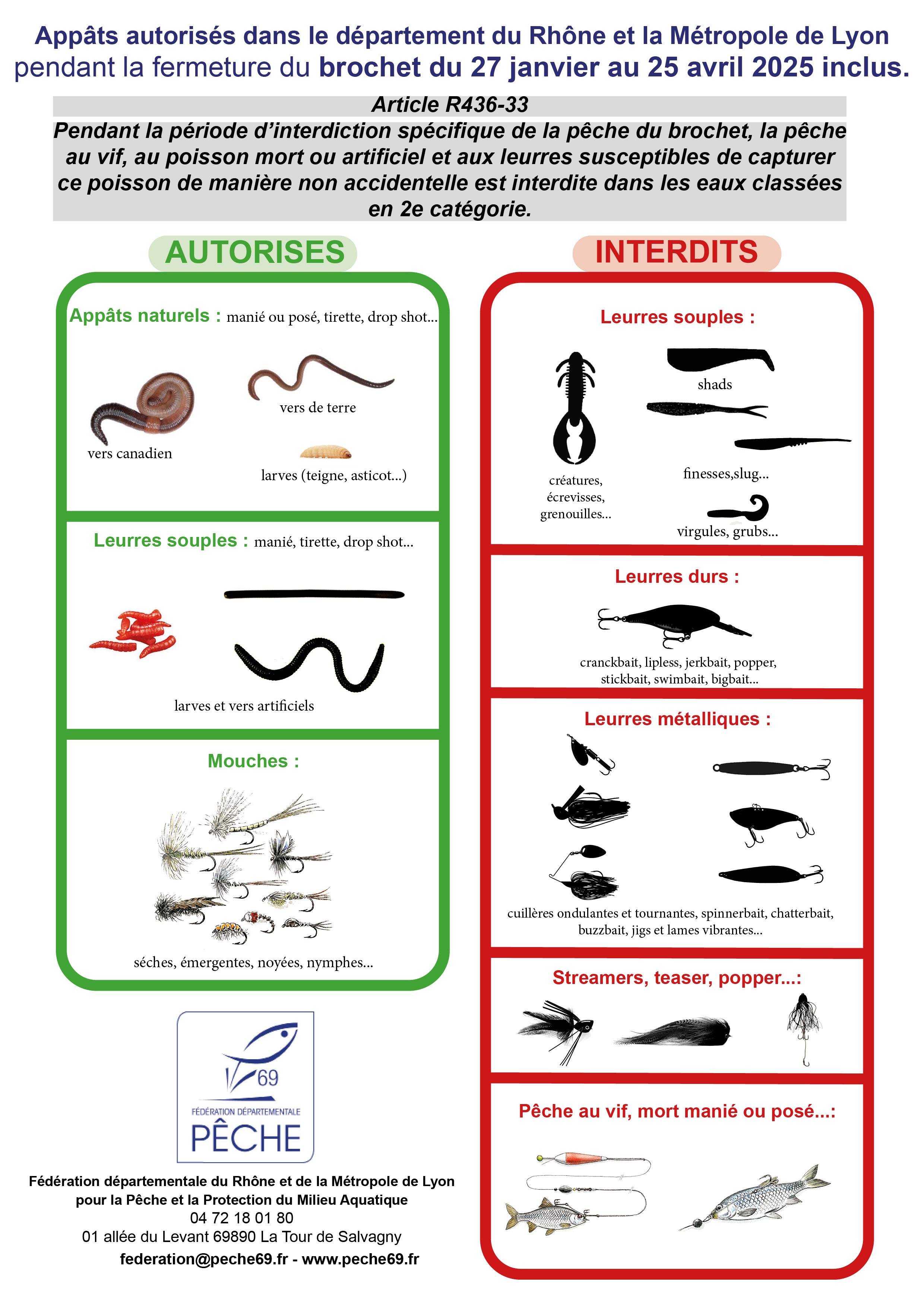 Le code de l’environnement mentionne « Pendant la période d’interdiction spécifique de la pêche du brochet, la pêche au vif, au poisson mort ou artificiel et aux leurres susceptibles de capturer ce poisson de manière non accidentelle est interdite dans les eaux classées en 2ème catégorie piscicole. » Par leurres, on entend les accessoires artificiels ou naturels qui de par leur forme sont susceptibles de capturer un brochet de manière non accidentelle et sont comparables au vif, au poisson mort et au poisson artificiel (sont interdit par exemples : le streamer, la cuillère, le plomb palette, le poisson nageur, leurres souples imitant poissons, écrevisses, batraciens …).