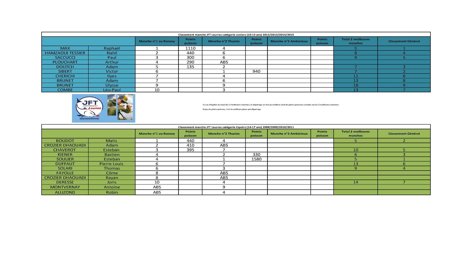 Le suspense est à son comble ! La saison du JFT Leurres arrive à son dénouement le samedi 8 novembre prochain. Tous les regards seront tournés vers le plan d'eau d'Ambérieux d'Azergues où se tiendra la grande finale. Ce sera l'occasion de couronner nos champions départementaux de la saison.